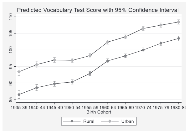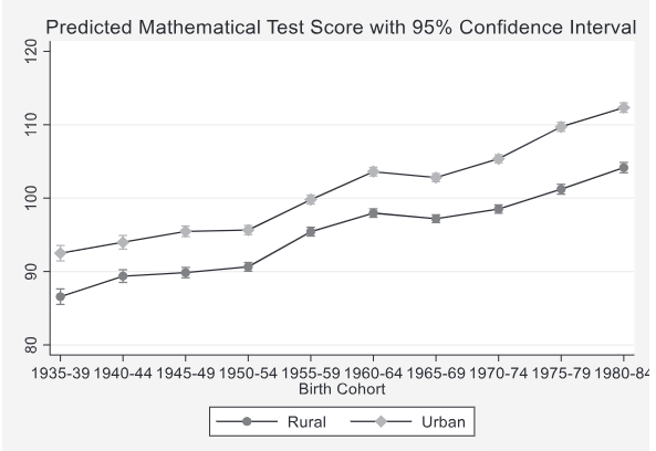 The rural-urban gap is really striking in those graphs—almost a full standard deviation difference by the later cohorts. What’s interesting is that this isn’t just about genetics or innate ability, but clearly about access to education and resources. It makes you wonder what China’s true cognitive potential would be if rural areas had the same opportunities as urban centers.