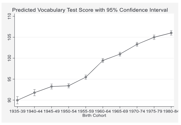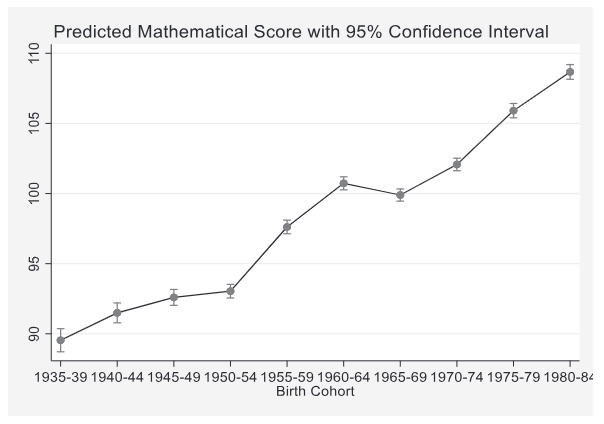 Based on results, there is evidently an increase in vocabulary and mathematical abilities across the different cohorts, therefore, verifying the Flynn effect in the largest population. The short dip in vocabulary could be caused by the emergence of new slang words and the dominant use of visual stimulations such as phones, TV, and video games affecting reliance on words/vocabulary in daily tasks. The socio-environmental factors were also studied using two dimensions of social stratification which are gender and place of residence.
